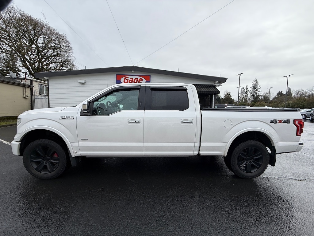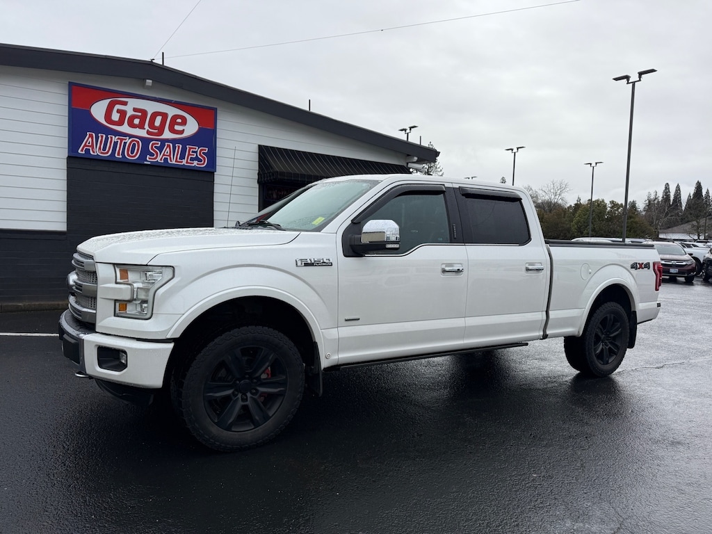 This vehicle is a 2016 Ford F-150 Platinum 4x4 SuperCrew 6.5 ft. SB with a 3.5 liter EcoBoost Twin Turbo V6 365hp 420 lb-ft engine and direct injection. It has a white platinum metallic tri-coat exterior and a black interior. It has driven 112,969 miles and has a crash test rating of 5 out of 5 stars. It also has active park assist, touch screen display, Bluetooth audio connection, blind spot sensor, hill start assist, and navigation system with voice recognition. This car also has a fuel economy of 16 mpg in the city and 22 mpg on the highway. It has a black leather interior and comes with a carfax report available for your review. This car is sure to turn heads wherever you go! Contact Details: Gage Auto Sales, 13432 SE McLoughlin Blvd., Milwaukie, OR, 97222, sales@gageauto.dealerspace.com, (888) 205-6257.