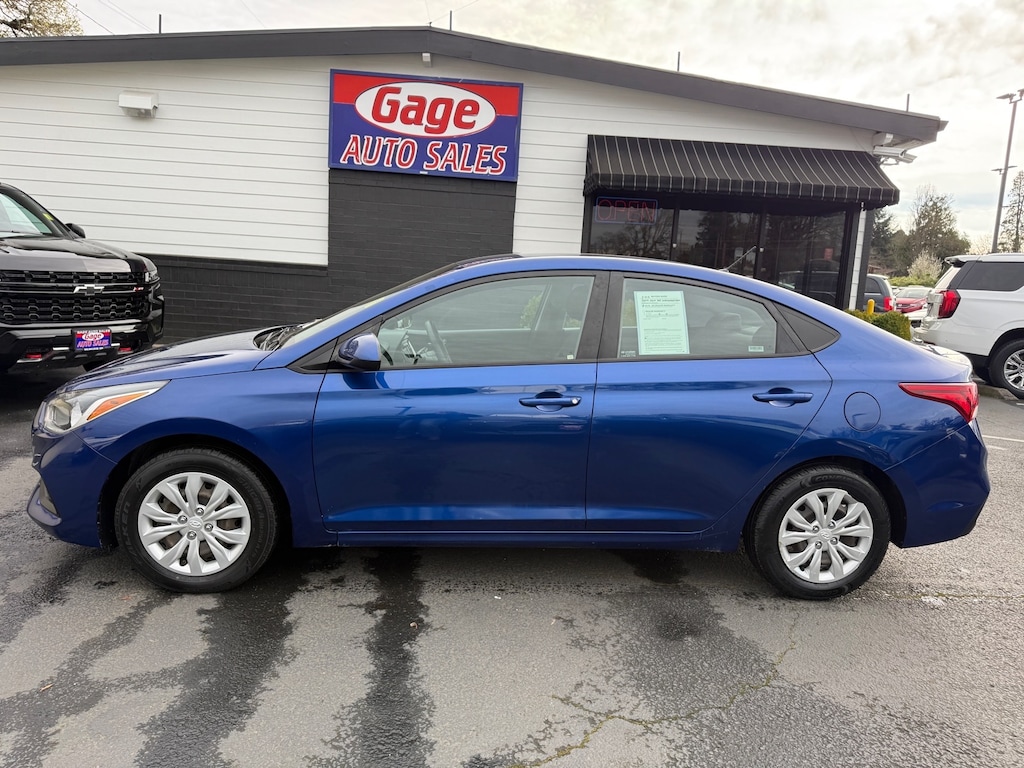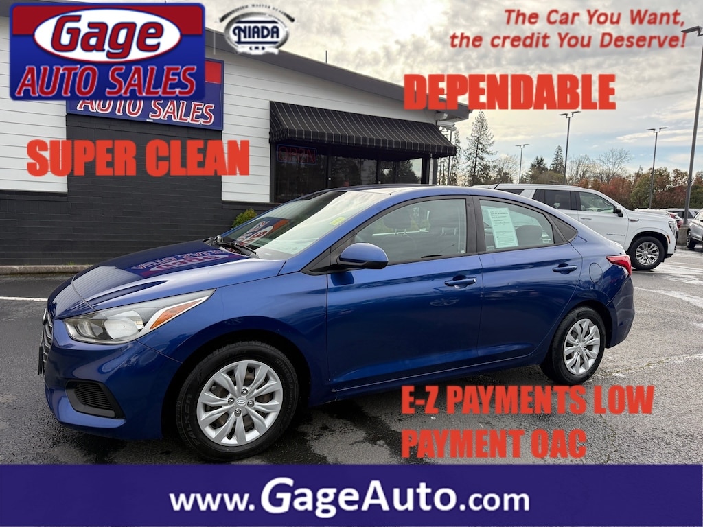 This 2021 Hyundai Accent SE 4dr Sedan CVT is a fantastic automobile with a FWD, 1.6 liter I4 120hp 113 lb-ft engine, direct injection, and an admiral blue exterior. It has driven 92,692 miles and has a crash test rating of 4 out of 5 stars. It also features a black interior, touch screen display, Bluetooth audio connection, hill start assist, Bluetooth phone connectivity, and fuel economy in city is 33 mpg and fuel economy on highway is 41 mpg. This car also comes with a carfax report available for your convenience. With its impressive fuel economy, crash test rating, and modern features, this car is sure to turn heads wherever you go! Contact Details: Gage Auto Sales, 13432 SE McLoughlin Blvd., Milwaukie, OR, 97222, sales@gageauto.dealerspace.com, (888) 205-6257.