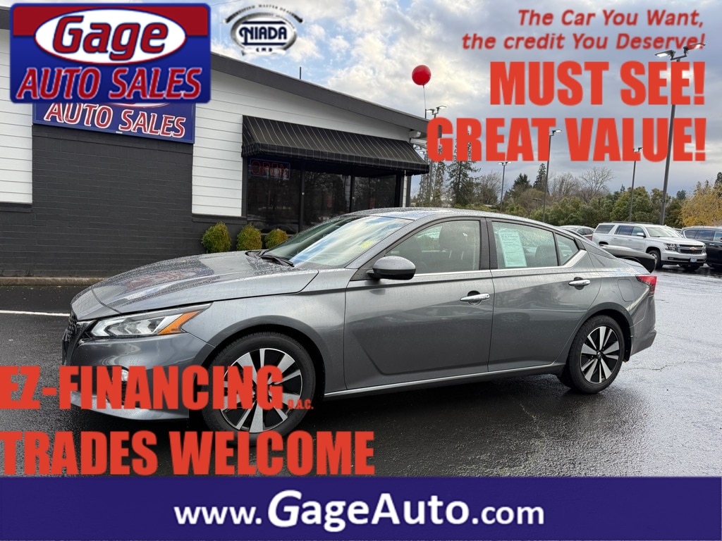 This vehicle is a 2021 Nissan Altima 2.5 SV 4dr Sedan with a gun metallic exterior and charcoal interior. It has a direct injection 2.5 liter I4 182hp 178 lb-ft engine with a fuel economy of 27 mpg in the city and 37 mpg on the highway. It has a crash test rating of 5 out of 5 stars and features such as touch screen display, Bluetooth audio connection, blind spot sensor, hill start assist, Apple Carplay ready, and Bluetooth phone connectivity. This car has been driven 65,188 miles and comes with a carfax report available for your review. With its fuel economy and safety ratings, this car is sure to be a reliable option for anyone looking for a reliable car. Contact Details: Gage Auto Sales, 13432 SE McLoughlin Blvd., Milwaukie, OR, 97222, sales@gageauto.dealerspace.com, (888) 205-6257.