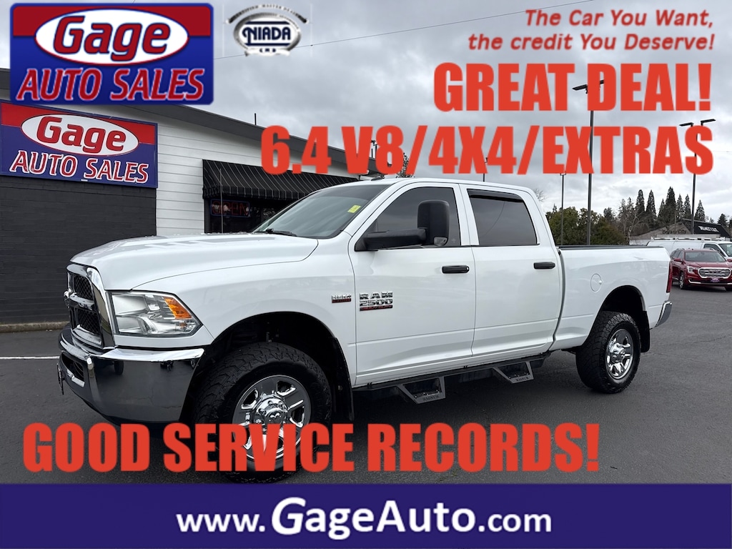 This 2017 RAM 2500 Tradesman is a powerful and reliable motorcar that has been meticulously maintained. With 146,271 miles on the odometer, this car has plenty of life left in it. Under the hood, it boasts a 6.4 liter HEMI V8 410hp 429 lb-ft engine with sequential multiport fuel injection, providing a powerful yet fuel efficient drive. The exterior of this car is a bright white clear coat, while the interior features a black/diesel gray combination. It has been awarded a crash test rating of 4 out of 5 stars, making it an excellent choice for those looking for safety and security. Hill start assist, part time four wheel drive, and parksense rear park assist are just a few of the features included in this car's impressive carfax report. Contact Details: Gage Auto Sales, 13432 SE McLoughlin Blvd., Milwaukie, OR, 97222, sales@gageauto.dealerspace.com, (888) 205-6257.