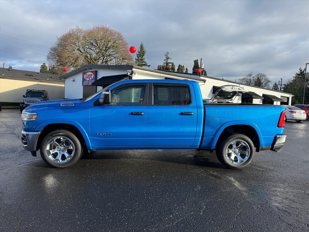 This vehicle is a 2025 RAM 1500 Lone Star 4x4 Crew Cab 5.6 ft. SB Pickup, with a 3.0 liter Hurricane Twin Turbo I6 420hp 469 lb-ft engine, direct injection. It has a hydro blue pearl coat exterior and a black interior. It has a fuel economy of 17 mpg in the city and 24 mpg on the highway, making it an efficient choice for those looking to save on gas. It also has a crash test rating of 4 out of 5 stars, making it safe for any driver. This motorcar also comes with many features such as touch screen display, Bluetooth audio connection, blind spot sensor, hill start assist, part time with on demand four wheel drive, and Bluetooth phone connectivity. Additionally, this car has been driven 11,932 miles and has a carfax report available for review. This car truly offers the best of both worlds - a reliable and efficient motorcar that still looks great on the road! Contact Details: Gage Auto Sales, 13432 SE McLoughlin Blvd., Milwaukie, OR, 97222, sales@gageauto.dealerspace.com, (888) 205-6257.