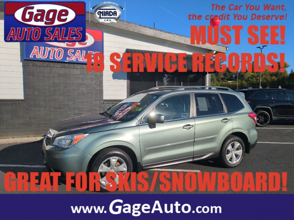 This vehicle is a 2014 Subaru Forester 2.5i Premium 4dr Wagon CVT with a Forester's all wheel drive system. It has driven 142,883 miles and is powered by a 2.5 liter H4 170hp 174 lb-ft engine with sequential multiport fuel injection. It has an impressive fuel economy of 24 mpg in the city and 32 mpg on the highway, making it an efficient choice for your daily commutes. It also has a crash test rating of 5 out of 5 stars, making it a safe choice for your family's safety. Additionally, this car comes with Bluetooth audio connection, hill start assist, full time four wheel drive, and Bluetooth phone connectivity as well as a carfax report available for your convenience. This car is sure to make your driving experience more enjoyable and safe with its reliable performance and features. Contact Details: Gage Auto Sales, 13432 SE McLoughlin Blvd., Milwaukie, OR, 97222, sales@gageauto.dealerspace.com, (888) 205-6257.