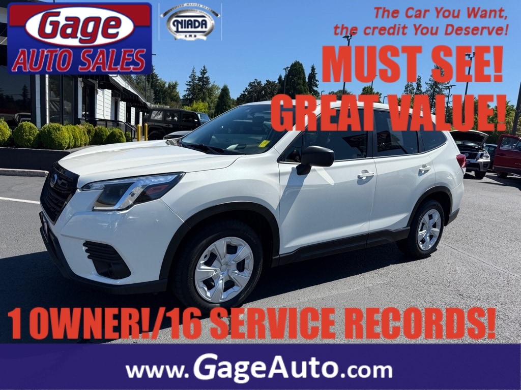 This vehicle is a 2022 Subaru Forester Base 4dr Crossover, with a crystal white pearl exterior and gray interior. It has driven 136,792 miles and is powered by a 2.5 liter H4 182hp 178 lb-ft engine with direct injection. It has a crash test rating of 5 out of 5 stars and features such as a touch screen display, Bluetooth audio connection, hill start assist, and full time four wheel drive. It also has Apple Carplay ready, Bluetooth phone connectivity, and a full time four wheel drive system for optimal performance. This car has been meticulously maintained and comes with a carfax report available for your review. With its fuel economy in city 26 mpg and fuel economy on highway 33 mpg, this car is sure to be a reliable and efficient option for your daily commutes. Contact Details: Gage Auto Sales, 13432 SE McLoughlin Blvd., Milwaukie, OR, 97222, sales@gageauto.dealerspace.com, (888) 205-6257.