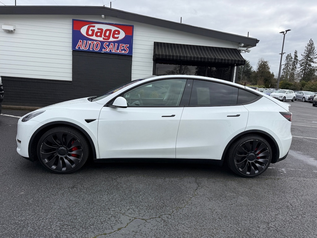 This vehicle is a Tesla Model Y Performance 4dr Crossover, made in 2021 with low mileage of 16,164 miles. It has an all wheel drive Electric 450hp 471 lb-ft engine and a pearl white multi-coat exterior. It has a black interior with leather seats and features such as touch screen display, Bluetooth audio connection, blind spot sensor, hill start assist, and full time four wheel drive. It has a crash test rating of 5 out of 5 stars and comes with a carfax report available for inspection. With its fuel economy in city at 115 mpg and fuel economy on highway at 106 mpg, this car is sure to be a great investment for anyone looking for an all wheel drive performance car. Contact Details: Gage Auto Sales, 13432 SE McLoughlin Blvd., Milwaukie, OR, 97222, sales@gageauto.dealerspace.com, (888) 205-6257.