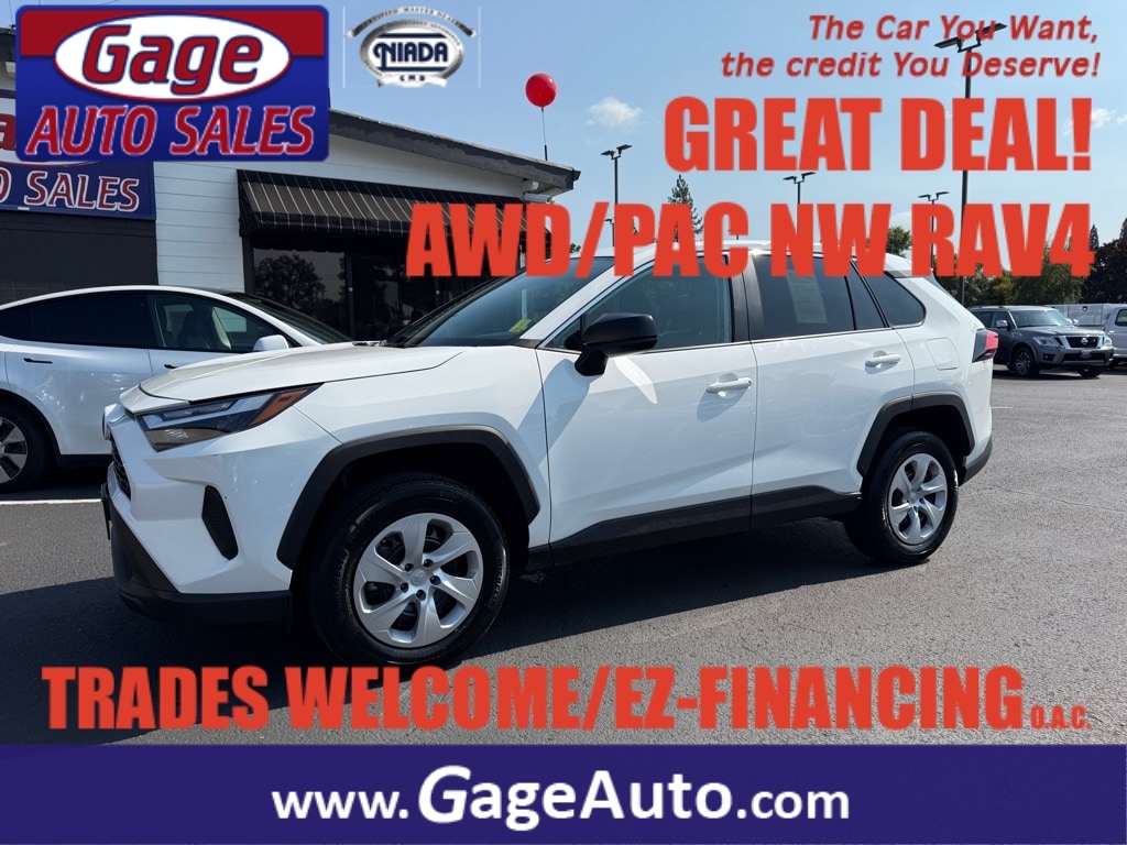 This vehicle is a 2024 Toyota RAV4 LE 4dr SUV with an ice cap exterior and all wheel drive. It has driven 30,162 miles and is powered by a 2.5 liter I4 203hp 184 lb-ft engine with direct injection. It has an ice cap exterior that is fuel efficient with 27 mpg in the city and 34 mpg on the highway. It has a black interior with features such as a touch screen display, Bluetooth audio connection, hill start assist, on demand four wheel drive, Bluetooth phone connectivity, and a crash test rating of 5 out of 5 stars. Additionally, this car has been certified by Carfax and comes with a carfax report available for review. Contact Details: Gage Auto Sales, 13432 SE McLoughlin Blvd., Milwaukie, OR, 97222, sales@gageauto.dealerspace.com, (888) 205-6257.